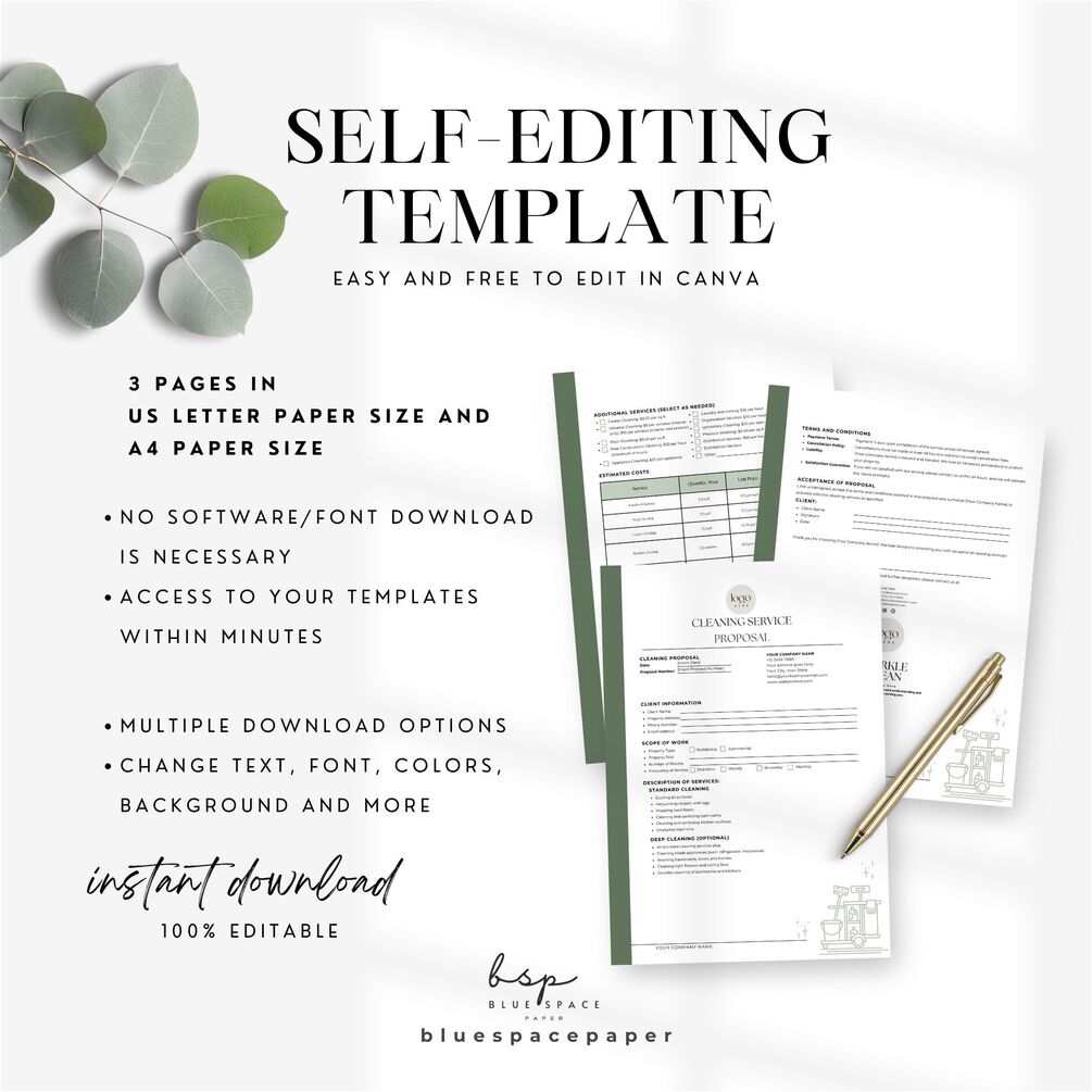 Cleaning Service Proposal Template Canva in US and A4 paper size